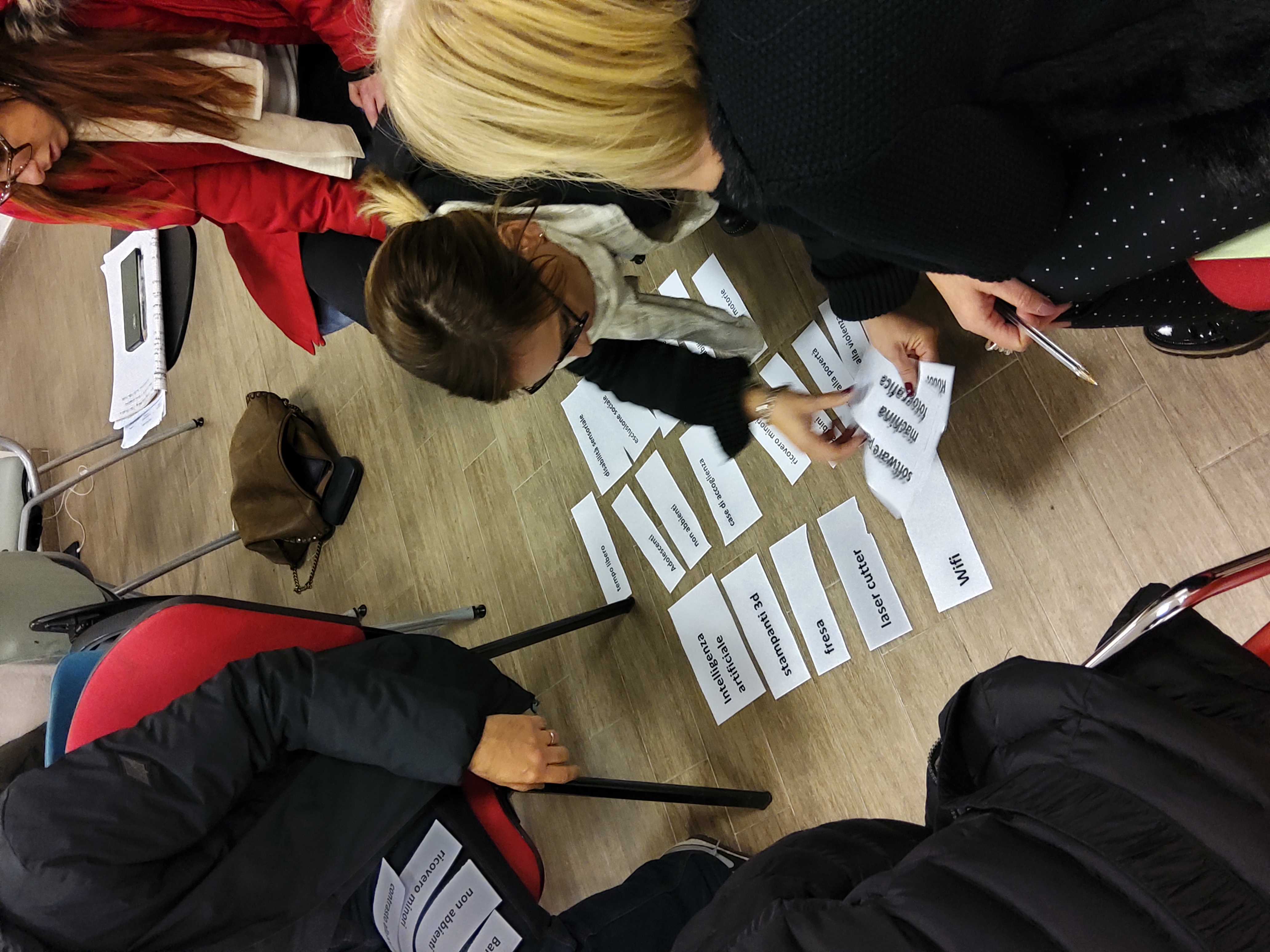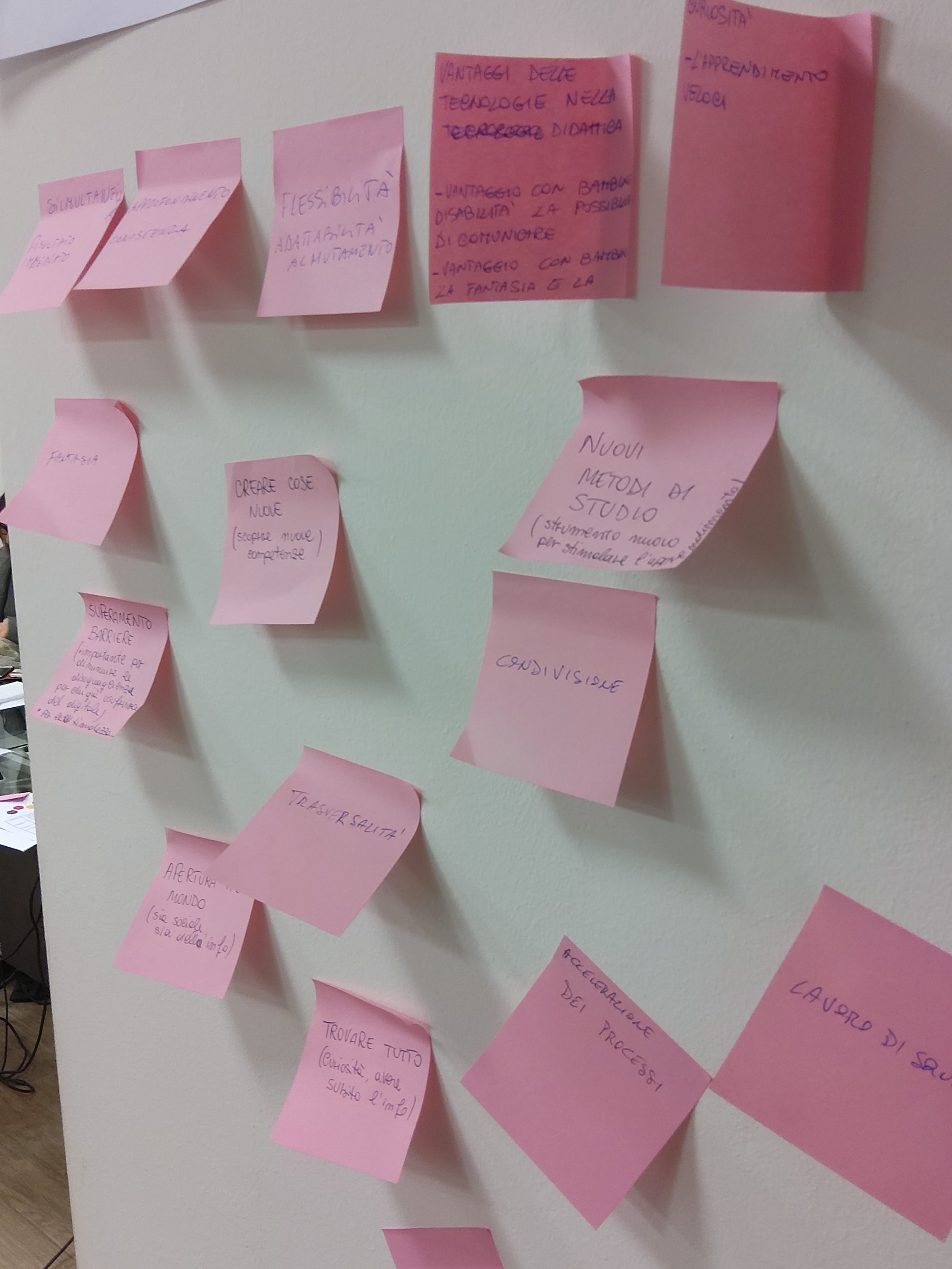 I partecipanti al seminario si sono cimentati con 3 esercitazioni nella seconda parte del seminario. Nella prima, hanno raccolto vantaggi e svantaggi del digitale per i minori e nella formazione. Successivamente, accostando delle targhette hanno associato due tecnologie digitali ad un problema che potrebbero risolvere e ad una categoria di minori che potrebbero beneficiarne.